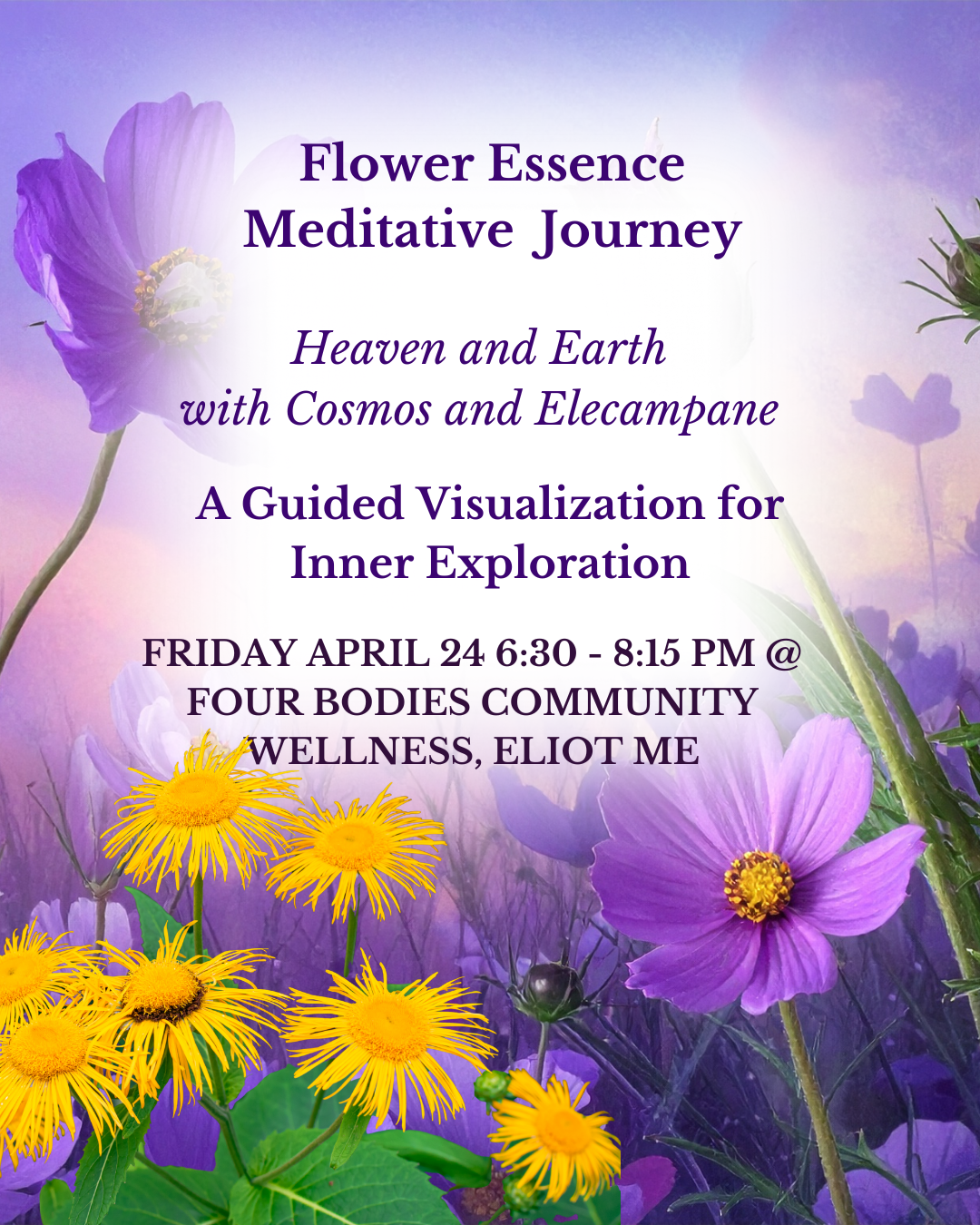 Cosmos and Elecampane will take you into the realms of your inner world through their connection to Heaven and Earth as you are guided through a safe, gentle and relaxing visualization.